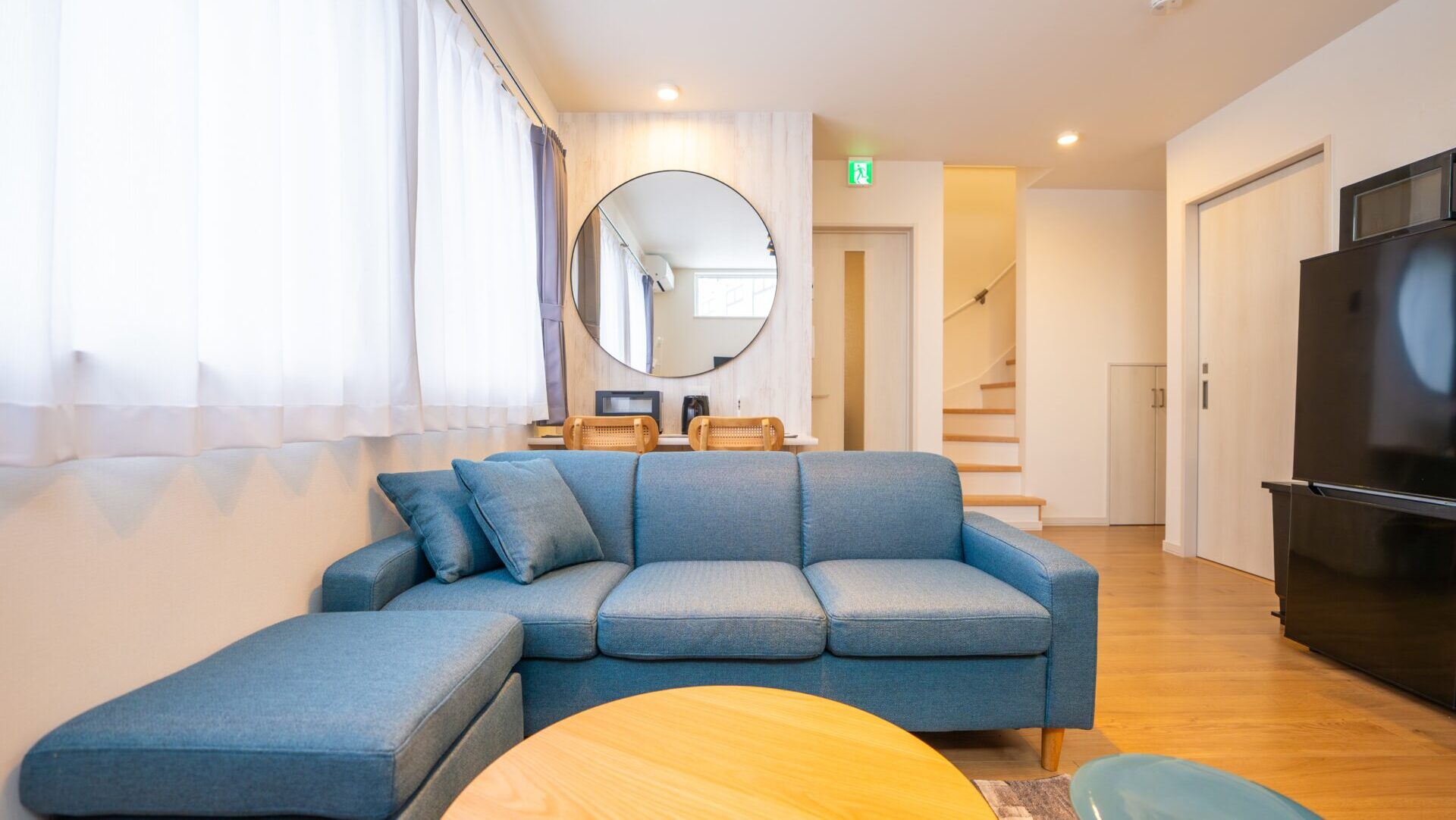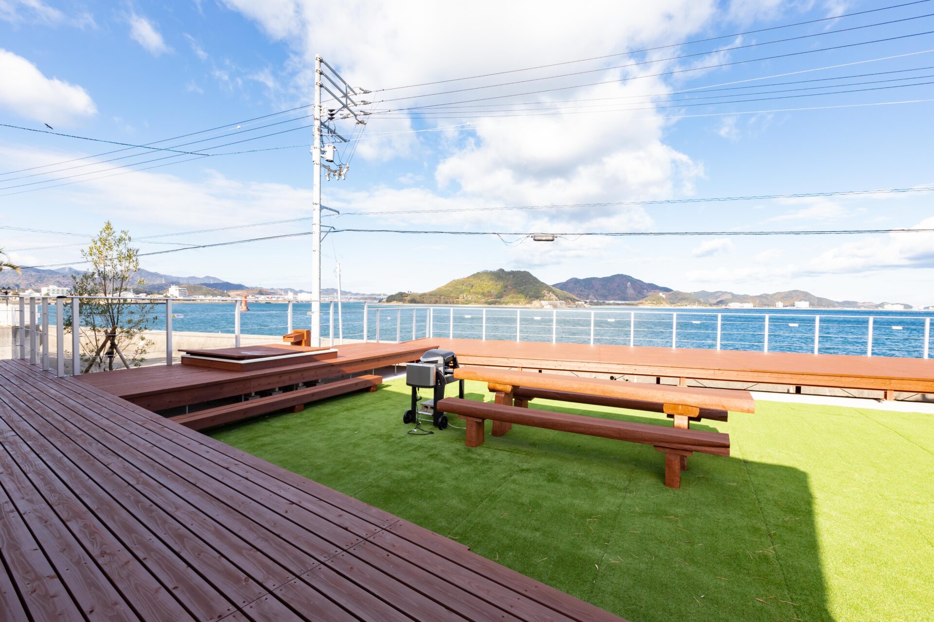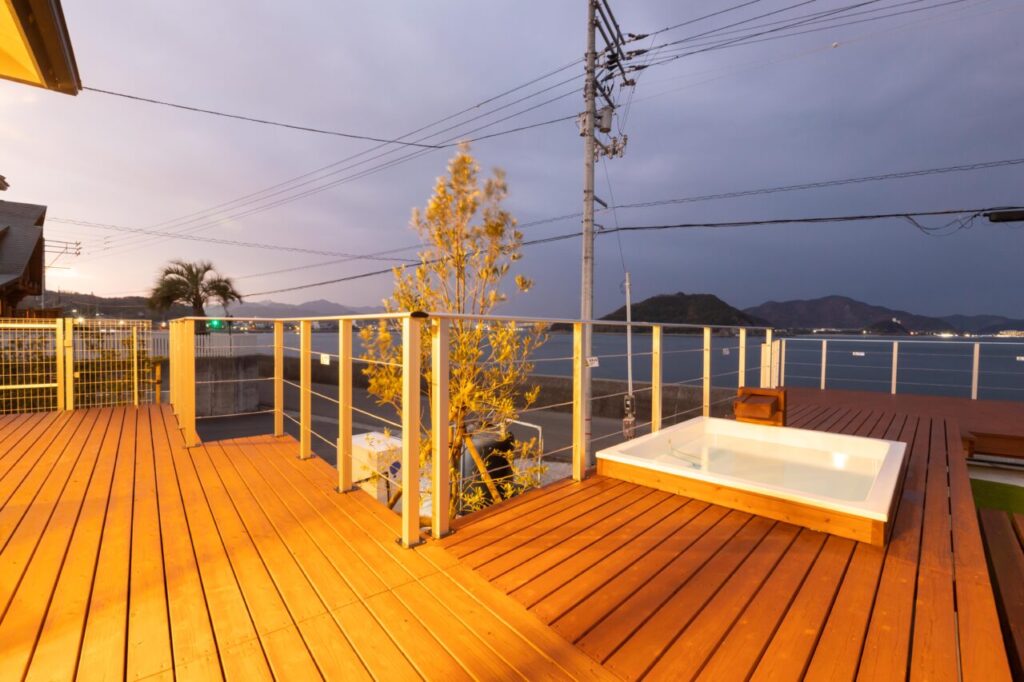 目の前に嗚門海峡(大鳴門橋)が眺められる、オーシャンフロントの宿です。広々としたリビングでは、海を眺めながらゆったりとおくつろぎいただけます。また、海が見える広いウッドデッキにはアウトバスとBBQを完備。もう一方の庭にはお子様向けのジャングルジムがあり、滞在を楽しむための設備が整っています。