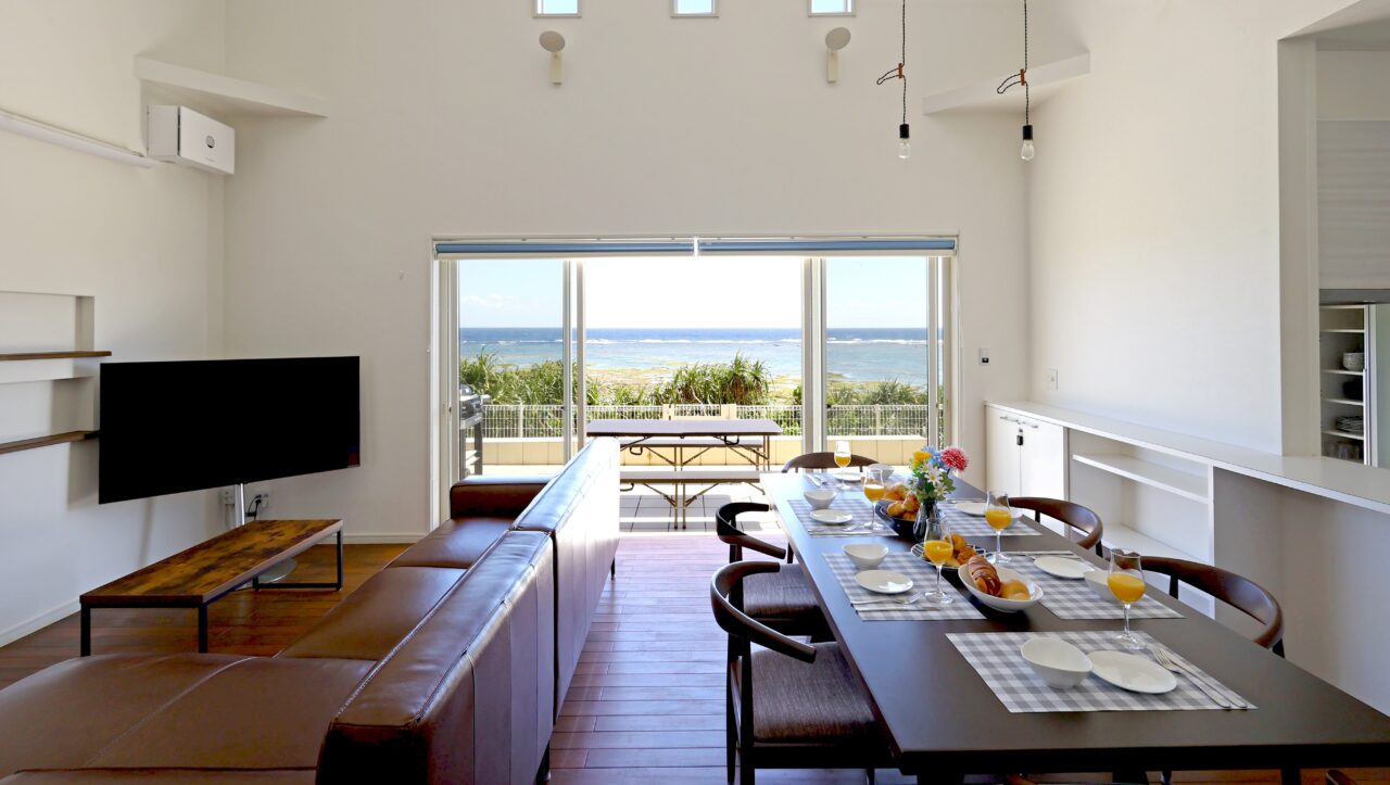 ラムサール条約の登録湿地である与那覇湾に面したオーシャンフロントの宿です。宮古空港から車で10分、東洋一と称される「与那覇前浜ビーチ」へも車で5分のアクセス。コンクリート打ちっ放しのお洒落な雰囲気の宿は、2LDKの広々とした室内です。リピングの窓を開けると、そこには与那覇湾の景色が広がっています。
