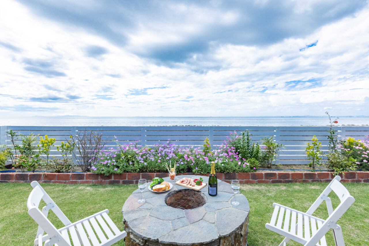 今、注目の淡路島西海岸に立地し、目の前に海が広がるオーシャンフロントの宿です。前オーナーが外国人女性だったこともあり、おしゃれな外観や内装を備えています。リビングやべッドルーム、庭など至るところから海を眺めることができ、天気が良い日にはその名の通り、美しいタ焼けを楽しめます。